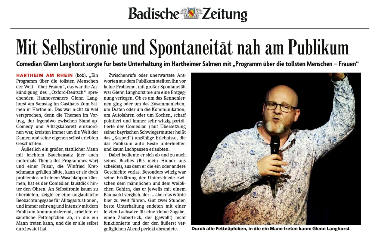 "Scharf pointiert und immer sehr witzig porträtierte der Comedian unzählige Erlebnisse, die das Publikum auf's Beste unterhielten und kaum Lachpausen erlaubten."