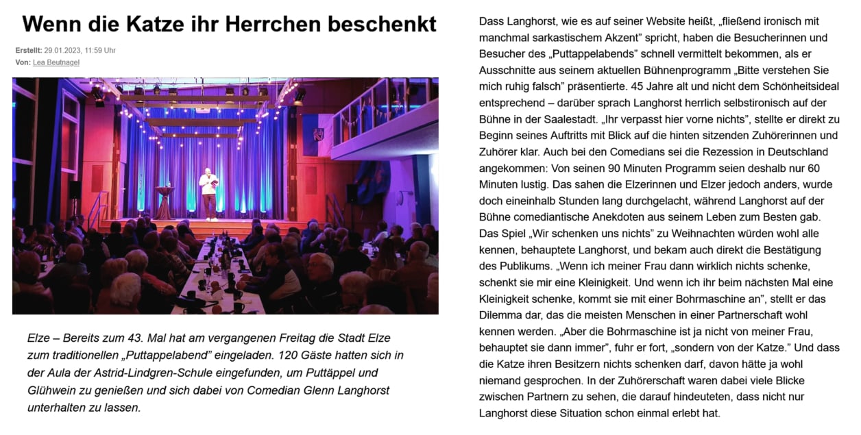 "Auch bei den Comedians sei die Rezession in Deutschland angekommen: Von seinen 90 Minuten Programm seien deshalb nur 60 Minuten lustig. Das sahen die Theaterbesucher jedoch anders, wurde doch eineinhalb Stunden lang durchgelacht, während Langhorst auf der Bühne comediantische Anekdoten aus seinem Leben zum Besten gab. "